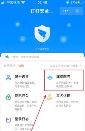 5、在“钉钉安全中心”界面我们再点击“冻结解冻”。