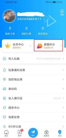 2、进去菜鸟裹裹我的界面之后,点击裹酱积分,如下图所示: