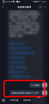 4、进入企业号小助手的聊天框,发送人工服务,再发送抖音企业号转个人号。