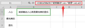将几个文本字符串合并为一个文本字符串,可将最多 255 个文本字符串联接成一个文本字符串。语法:CONCATENATE (text1,text2,...)Text1, text2, ... 为 1 到 30 个将要合并成单个文本项的文本项。这些文本项可以为文本字符串、数字或对单个单元格的引用。打开表格,在B1单元格输入=CONCATENATE("能够触动",A1,"就是...